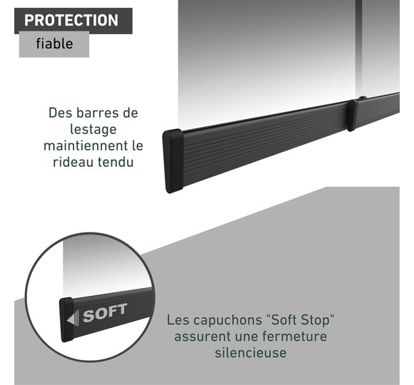 - Les lests maintiennent le rideau tendu et les embouts en caoutchouc assurent une fermeture silencieuse
