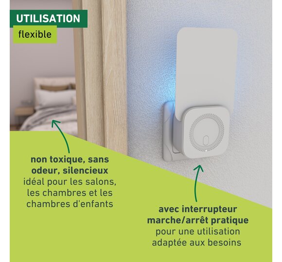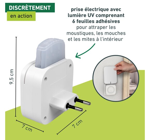 Comment ça marche ?Retirez le film de protection de la plaque adhésive, placez cette dernière sur la prise électrique, insérez le piège collant préparé dans la prise. Le tour est joué ! L’interrupteur marche/arrêt pratique permet d’activer le piège selon les besoins.