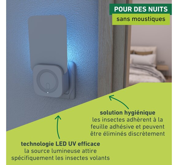 Les insectes indésirables sont attirés par la technologie UV LED. Dès qu’ils se posent sur le dos de la plaque adhésive, ils y restent collés et sont ainsi éliminés discrètement et hygiéniquement. Le piège adhésif discret fonctionne sans poison. De plus, il ne dégage ni odeur ni bruit désagréable. Il peut donc parfaitement être utilisé dans le salon ainsi que dans les chambres. Le piège compact est également un compagnon de voyage pratique.