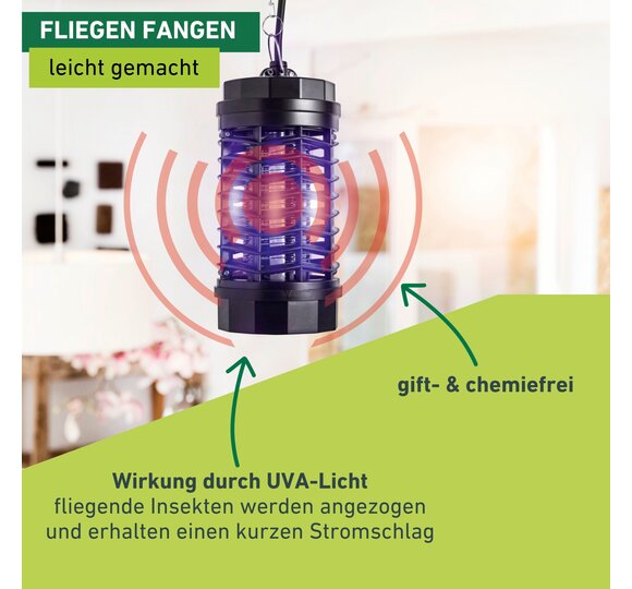 Aucun produit chimique n’est utilisé pour attirer et tuer les insectes. Dès que la lampe est branchée, elle est prête à être utilisée. La lampe de protection de 4 watts émet une lumière UVA qui est inoffensive pour les humains et les animaux. La grille sous tension électrique est protégée par un boîtier en plastique entièrement isolé de sorte qu’il est impossible de passer la main à travers par inadvertance.