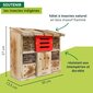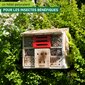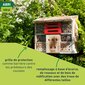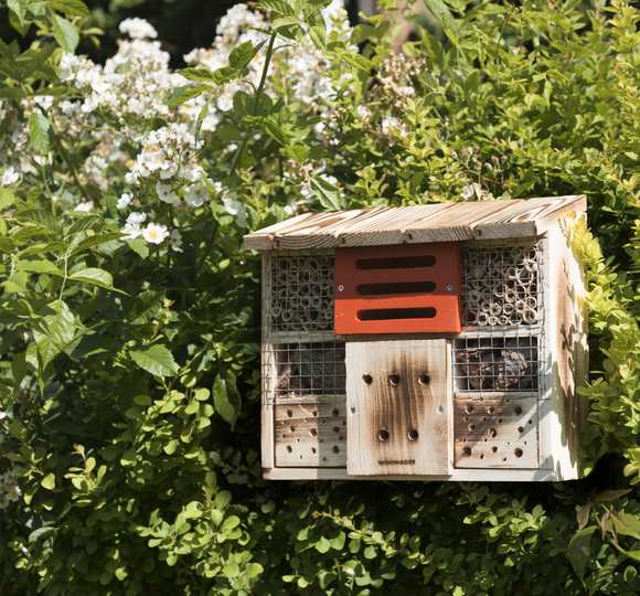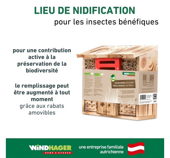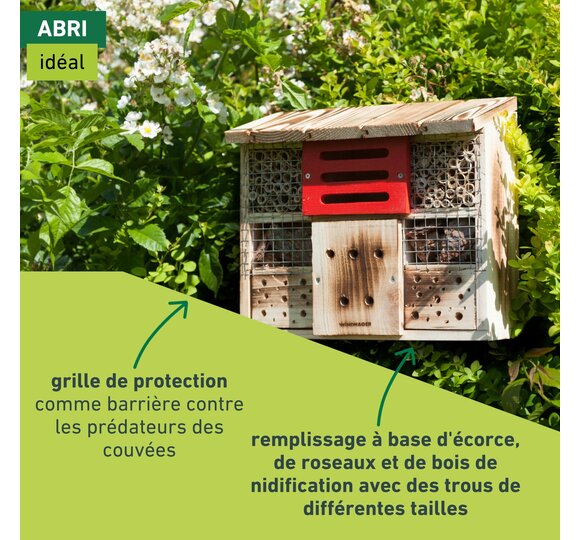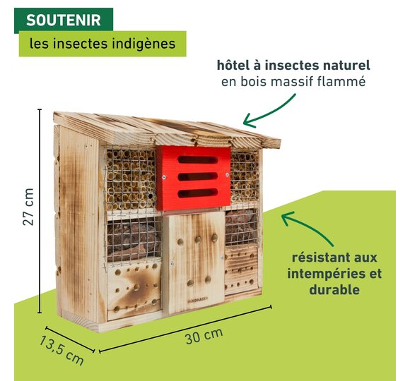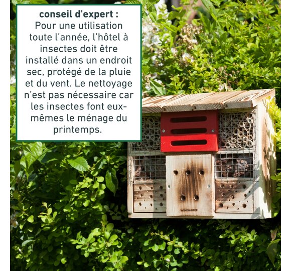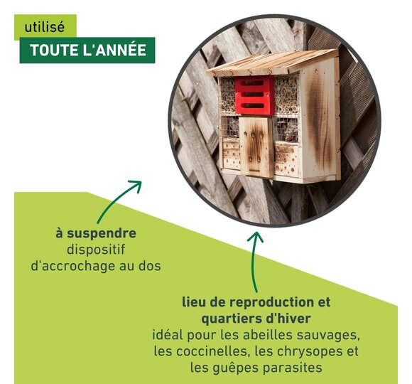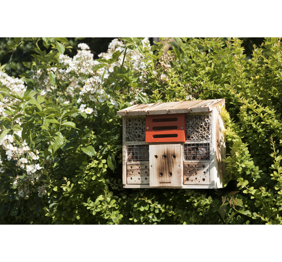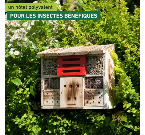 Cet hôtel peut se targuer d’être particulièrement utile pour la protection des insectes auxiliaires de l’écojardinage. Ses hôtes (abeilles sauvages, ichneumons, pince-oreilles, coccinelles, bourdons) pollinisent les fleurs des alentours et se repaissent d’insectes nuisibles comme les pucerons ou les tétranyques dites « araignées rouges ». Le rabat rouge (pour chrysopes) est facile à dévisser pour le nettoyage.