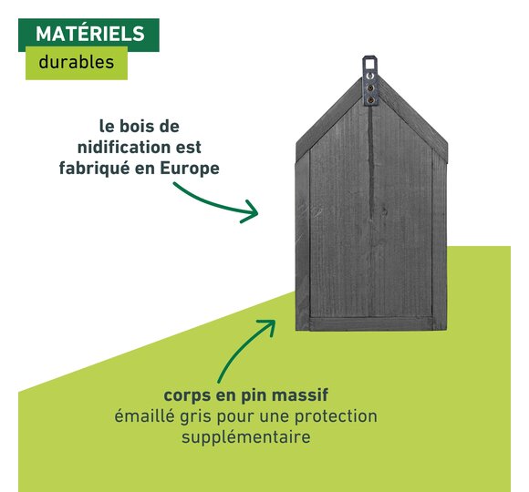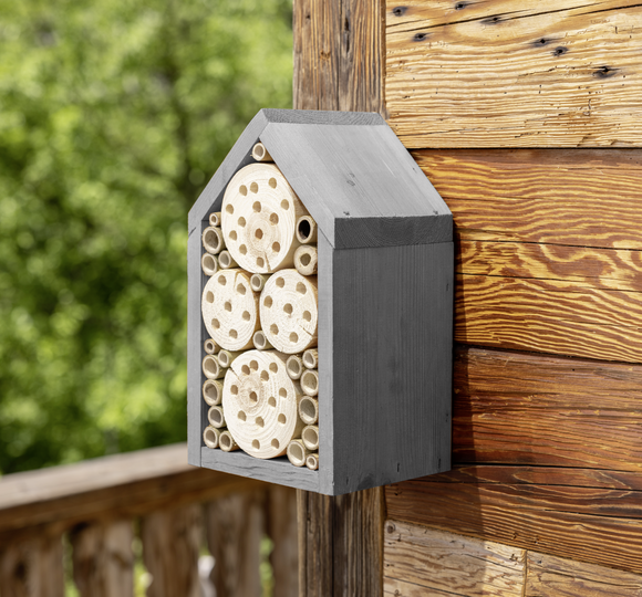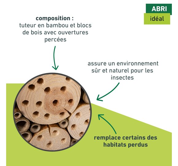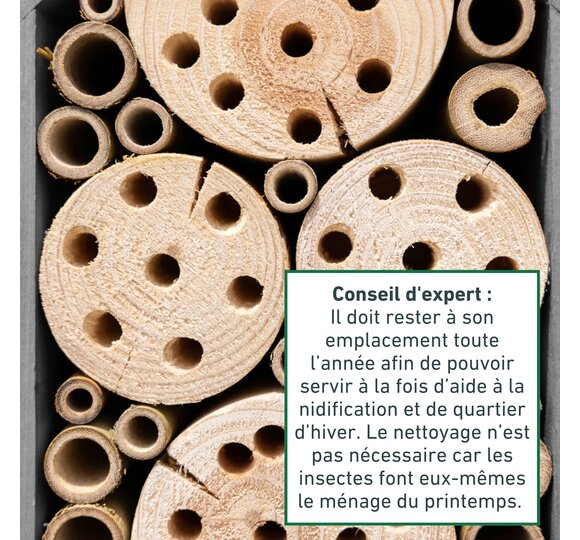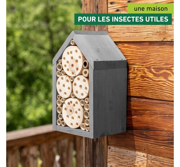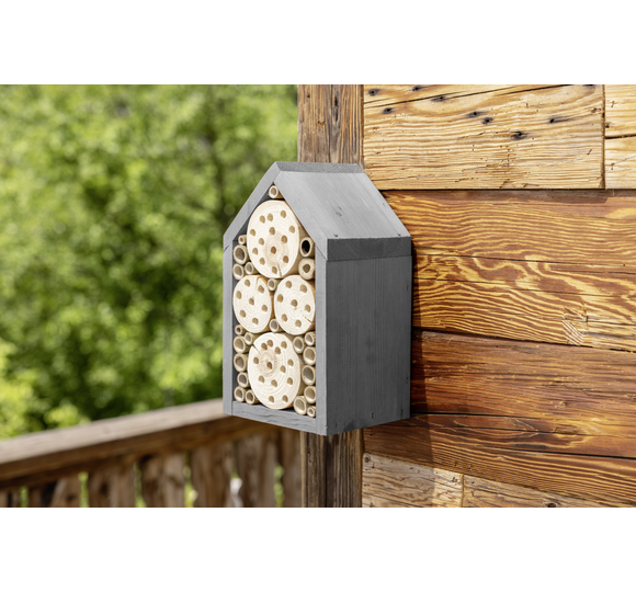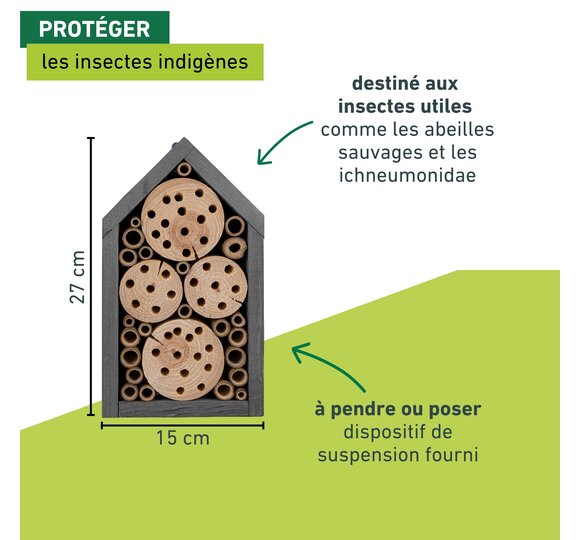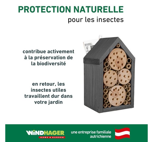 L'hôtel à insectes offre aux abeilles sauvages et aux ichneumons un espace suffisant pour y faire leur nid. Des blocs de bois découpés et des tiges de bambou collées entre elles créent un environnement sûr et naturel pour les insectes. Le bois de nidification est fabriqué en Europe et peut être facilement accroché.