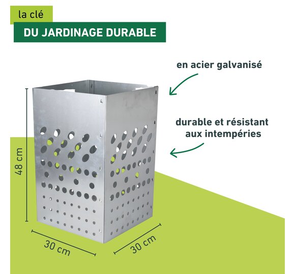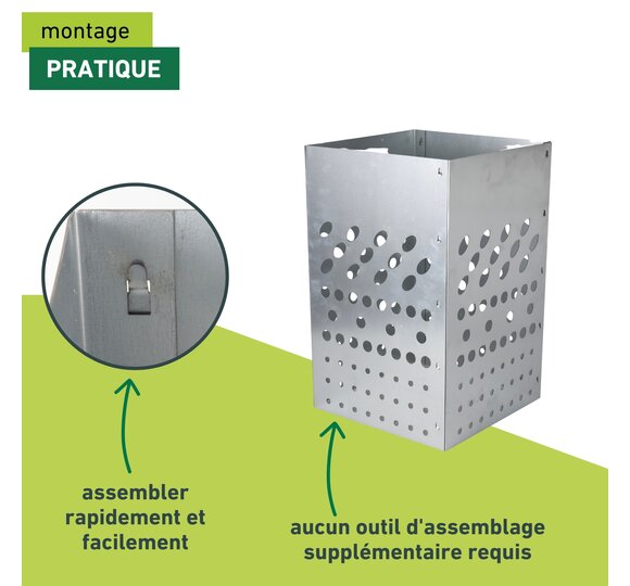 Conçu en acier galvanisé, le composteur pour potagers surélevés est très durable et résiste aux intempéries. Il s’assemble en un clin d’œil et ne requiert aucun outil supplémentaire.