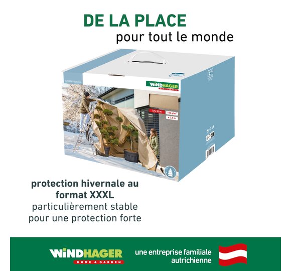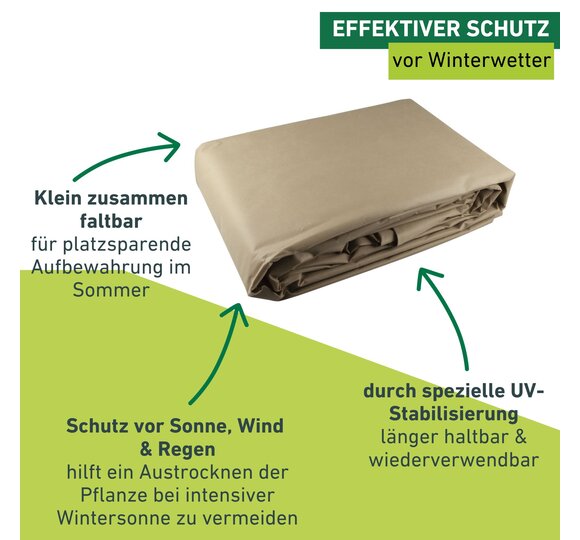 Les plantes même résistantes au gel profitent de cette housse thermique XXXL, car elle protège contre le vent froid ainsi que du soleil d’hiver intense, et réduit l’évaporation et ainsi l’assèchement en définitive de la plante. Elle aide les plantes à feuilles persistantes à passer l’hiver. Le non-tissé antigel atténue également les variations de température – ce qui est important pour les plantes sans feuille, car l’écorce pourrait être endommagée.