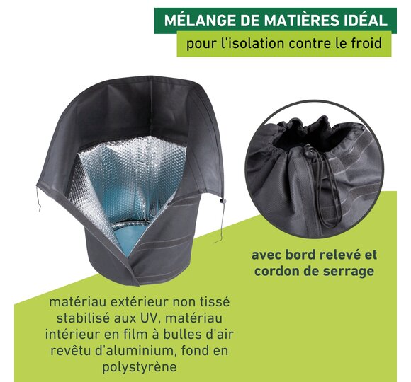 Le voile d’hivernage spécial pour pot permet à vos plantes de passer l’hiver sans encombre et il s’utilise sans problème à l’extérieur. Le structure et le choix intelligent des matières de cette protection contre le froid la rendent particulièrement efficace: le fond est en polystyrène isolant de 3 cm ou 5 cm et l’intérieur est garni d’un film à bulles à revêtement en aluminium. La matière non tissée gris foncé et son bord surélevé protègent bien le pot, la plante et ses racines, et un cordon permet de fermer le voile.