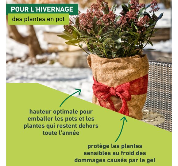 Cette natte spéciale 100 % fibre de jute protège les (jeunes) arbres, plantes en pot et plantes sensibles au froid contre le gel. Sa hauteur est idéale pour entourer les plantes. Pour la fixer, utilisez une corde souple en jute ou coco. Le tissu en jute peut être recoupé avec des ciseaux en fonction de la taille de la plante.
