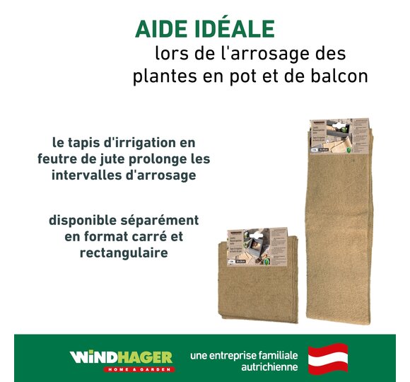 Le tapis d’irrigation en feutre de jute est l’accessoire idéal pour l’arrosage des plantes en pot et de balcon. Il stocke l’eau et maintient un taux d’humidité uniforme des plantes. Cela permet de réduire l’arrosage et de diminuer l’humidité stagnante de manière ciblée.