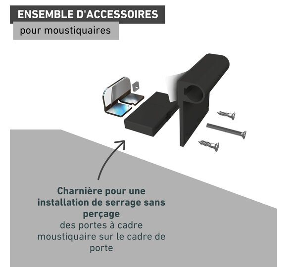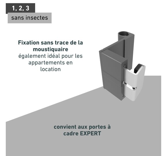 Pour la pose de porte de protection contre les insectes EXPERT, vous n'aurez pas besoin d’une perceuse. Le cadre de serrage se monte à l’aide de charnières à clipser, sans abimer le cadre de la porte. Pour cette raison, cette innovation n’est pas seulement adaptée aux logements loués, mais aussi pour ceux qui ne souhaitent pas abimer le cadre de leur porte.