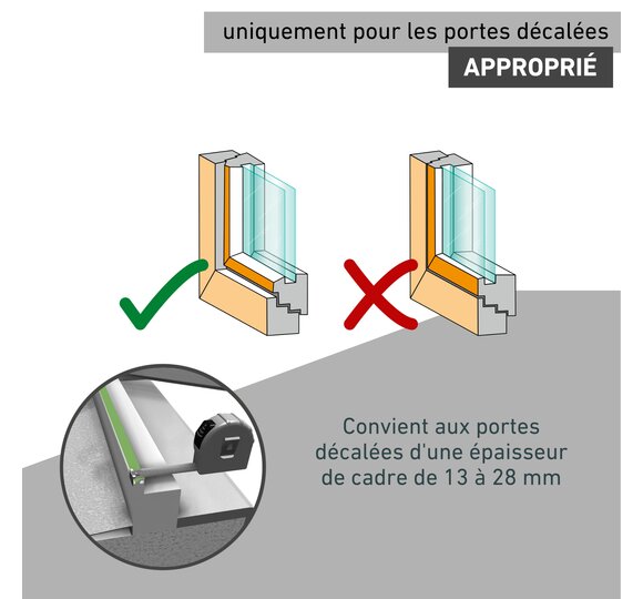 - Adapté pour les portes à surfaces décalées avec un châssis dormant de 13 à 28 mm