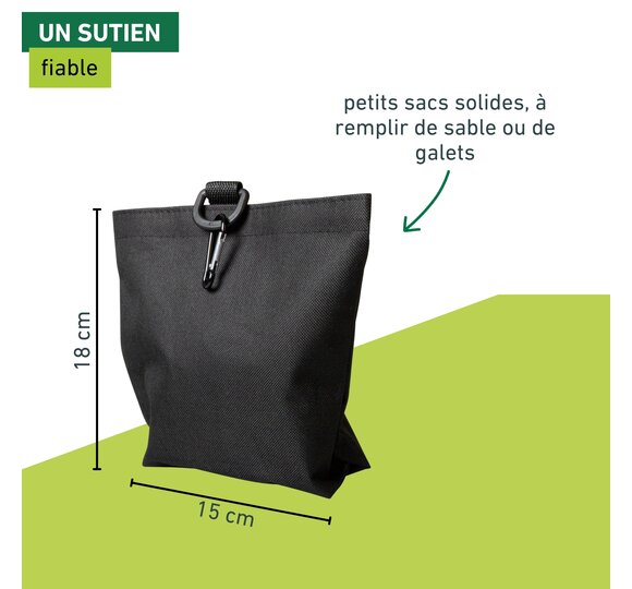 Remplissez simplement le sac intérieur de sable ou de galets (env. 2 kg par sac) et fermez-le sans peine grâce à la fermeture éclair. Le sac extérieur en tissu, particulièrement résistant, peut être ouvert à tout moment grâce à la fermeture Velcro. Le mousqueton pratique accroît encore les possibilités de fixation. Une fois vides, les sacs de sable MINI se replient, pour un encombrement minime.