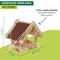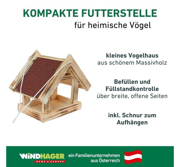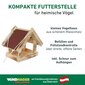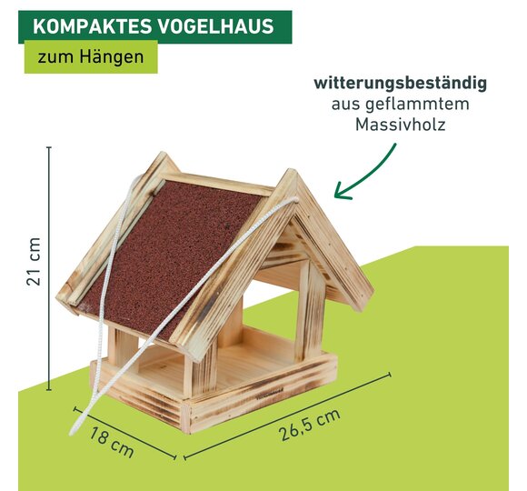Amis oiseaux, soyez les bienvenus. Composée de bois massif résistant aux intempéries, cette mangeoire à oiseaux se décline dans une surface rabotée, passée à la flamme. Le toit est recouvert de carton de couleur foncée. L’absence de murs permet de voir facilement la quantité de nourriture disponible.