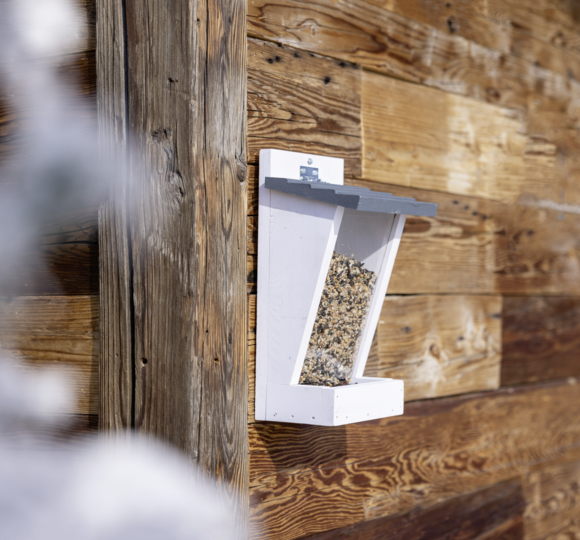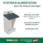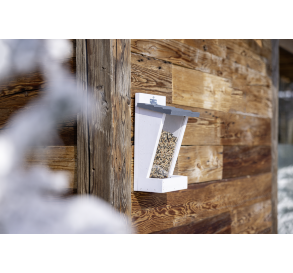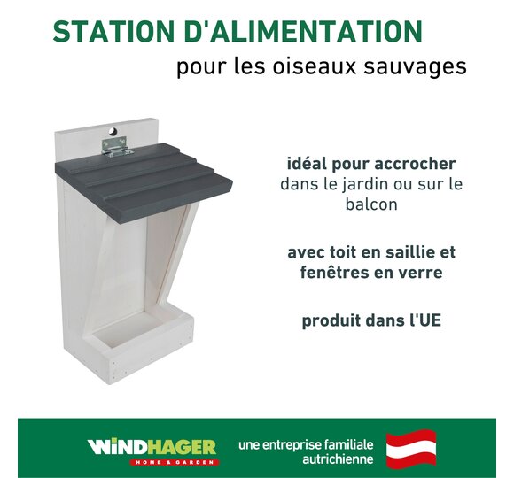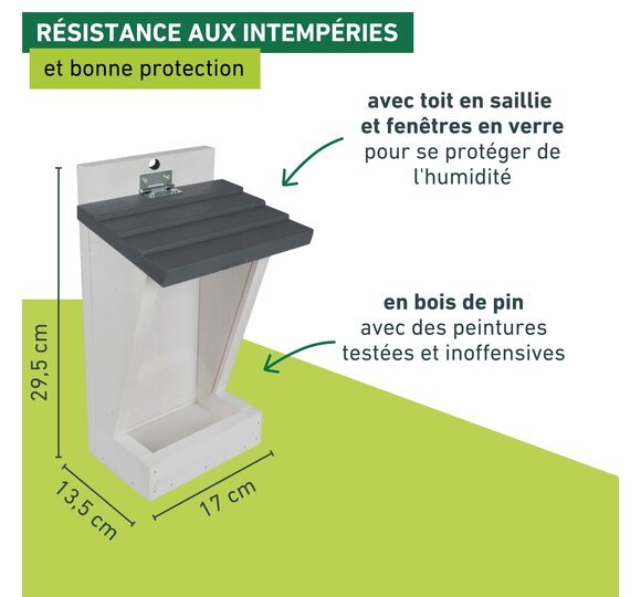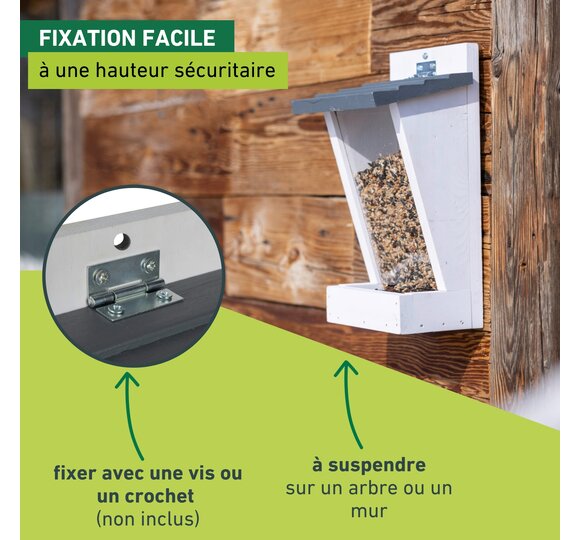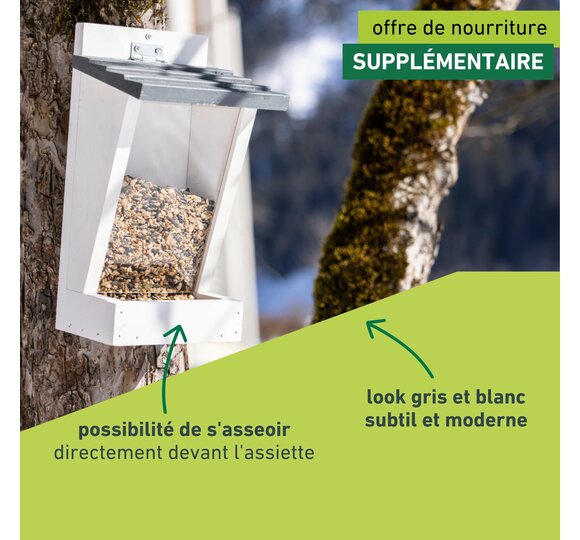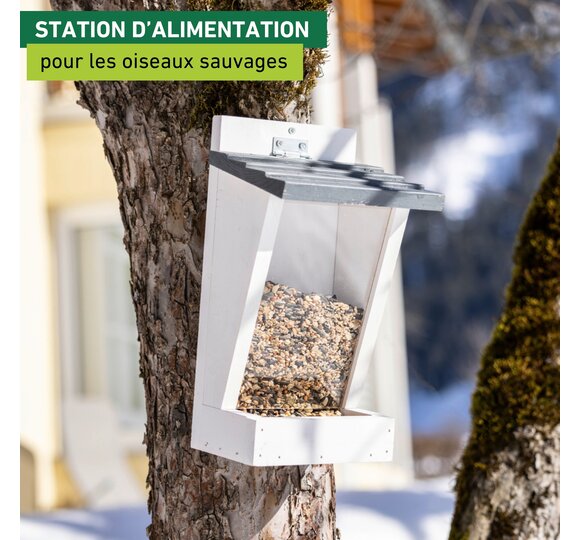 - STATION D’ALIMENTATION POUR OISEAUX – Cette petite maison discrète en bois de pin aux couleurs grise et blanche offre aux oiseaux une précieuse source de nourriture en hiver. Les peintures utilisées ont été testées et ne présentent aucun risque. Fabrication européenne.