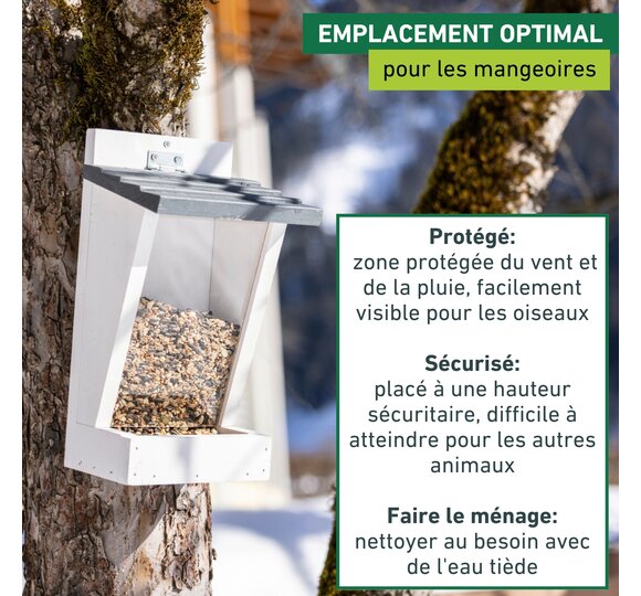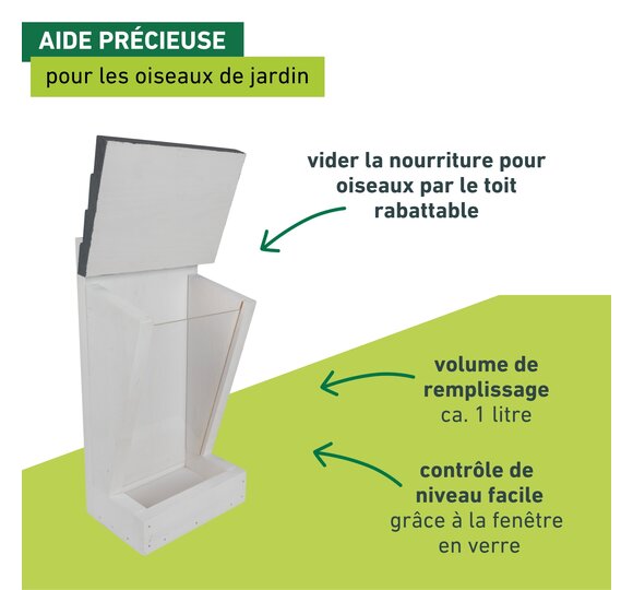 - REMPLISSAGE FACILE - L’intérieur de la mangeoire peut être vidé par le toit rabattable. Volume de remplissage env. 1 litre.