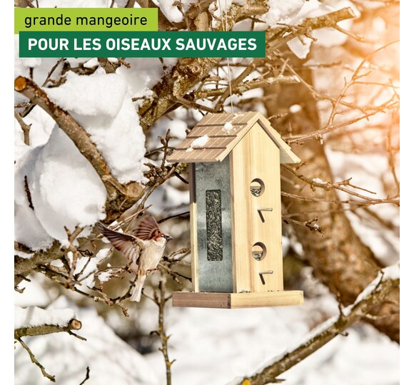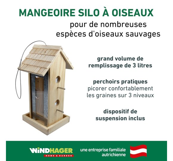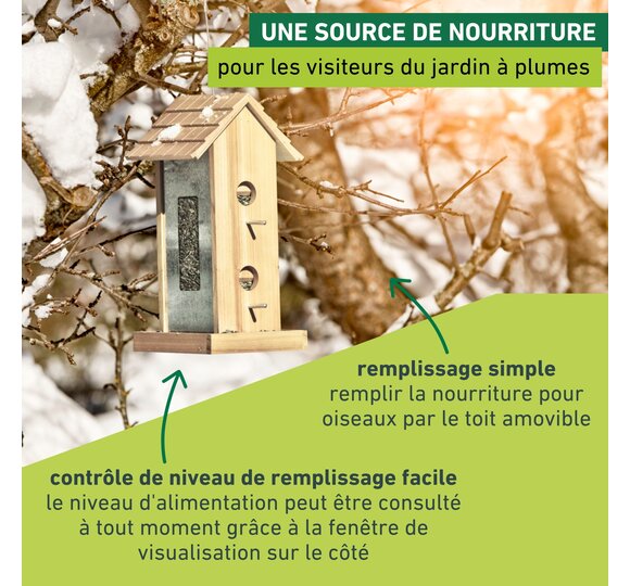 Ce réservoir d’alimentation approvisionne vos amis à plume d’une manière idéale lors de la constitution des réserves énergétiques afin de résister aux durs mois d’hiver. Grâce à la couleur chaleureuse du bois, il est en outre un point lumineux dans la saison autrement si grise et froide, qui conjure de la chaleur dans votre jardin.