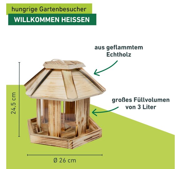 Amis oiseaux, soyez les bienvenus. Composée de bois massif résistant aux intempéries, cette mangeoire silo à oiseaux se décline dans une surface rabotée, passée à la flamme. Construction hygiénique en forme de silo qui se remarque. Des fenêtres vitrées pour contrôler facilement la quantité de nourriture sont placées des deux côtés. La production des matières premières et la fabrication ont été effectuées dans l’UE.
