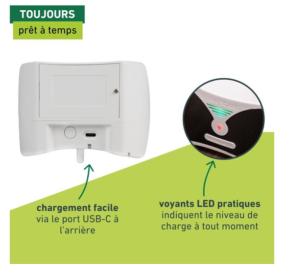 Avec sa batterie pouvant tenir jusqu’à 10 jours consécutifs, cet appareil de protection contre les nuisibles peut être installé sans fil à l’endroit souhaité. Des voyants LED pratiques indiquent à tout moment le niveau de charge, de sorte que l’appareil peut toujours être rechargé à temps via le port USB-C.