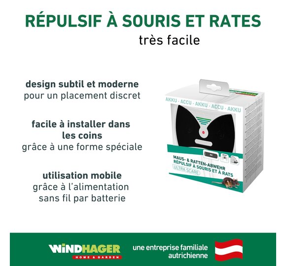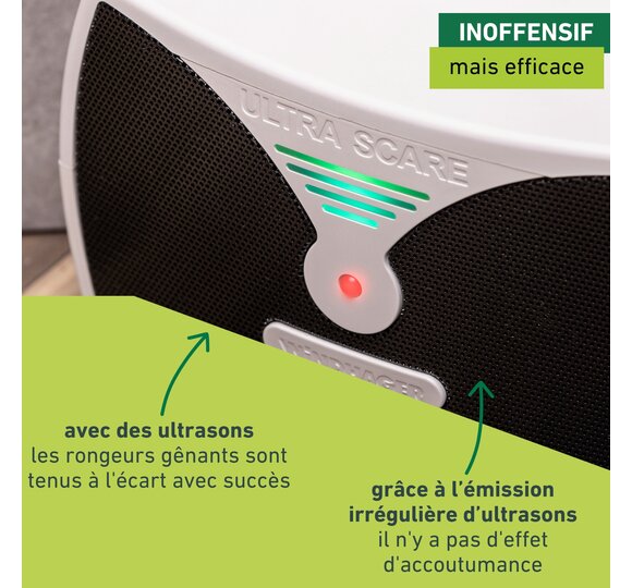 L’appareil répulsif contre les souris et rats ULTRA SCARE éloigne efficacement les nuisibles comme les souris, rats, loirs, fouines et ratons laveurs à l’aide d’ultrasons. L’émission irrégulière de ceux-ci permettent d’éviter que les nuisibles s’y habituent. La protection reste donc efficace même en cas d’utilisation permanente. Mieux : l’appareil est totalement inoffensif pour l’homme et les animaux domestiques, car il n’utilise ni poisons, ni produits chimiques.