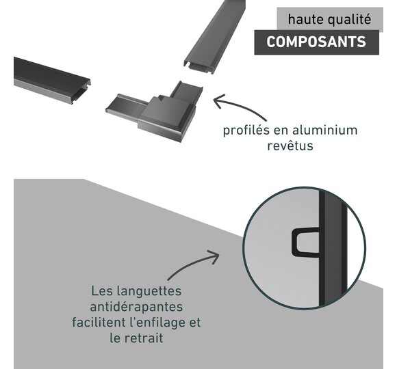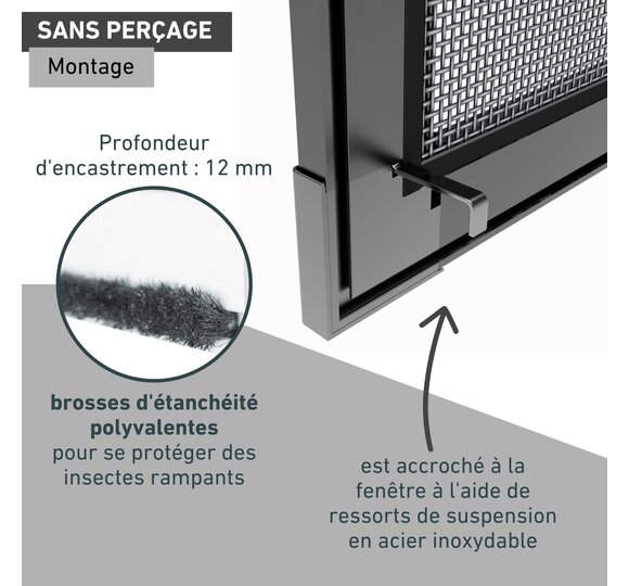 - COMPOSANTS DE HAUTE QUALITÉ - profilés en aluminium revêtus, toile en fibre de verre robuste, brosses d'étanchéité sur le pourtour et languettes de préhension facilitant le maniement.
