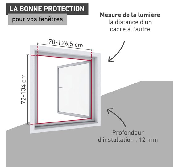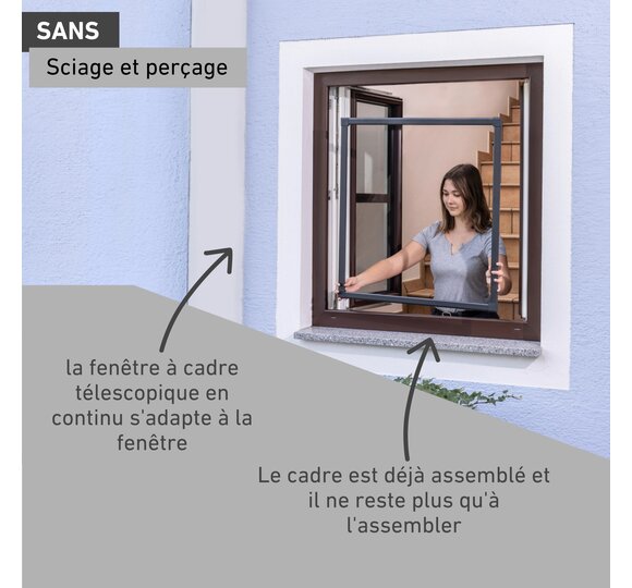 Le cadre est préassemblé et s’adapte en continu à la fenêtre, quel qu'en soit le format, en déplaçant les éléments télescopiques. Il se fixe alors à l'aide de vis de serrage et d'embouts, la toile se coince et le grillage s’accroche à la fenêtre à l'aide de ressorts d'accrochage.