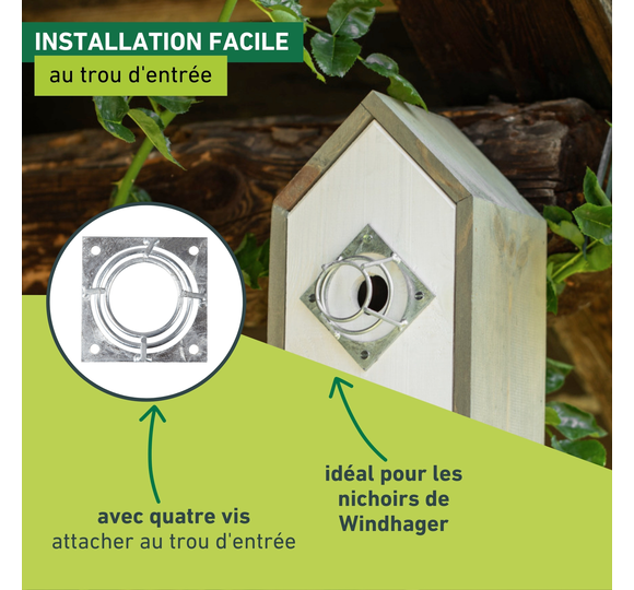 • poser tout simplement – le cadre protecteur est vissé devant le trou du nichoir (vis comprises)