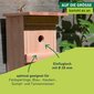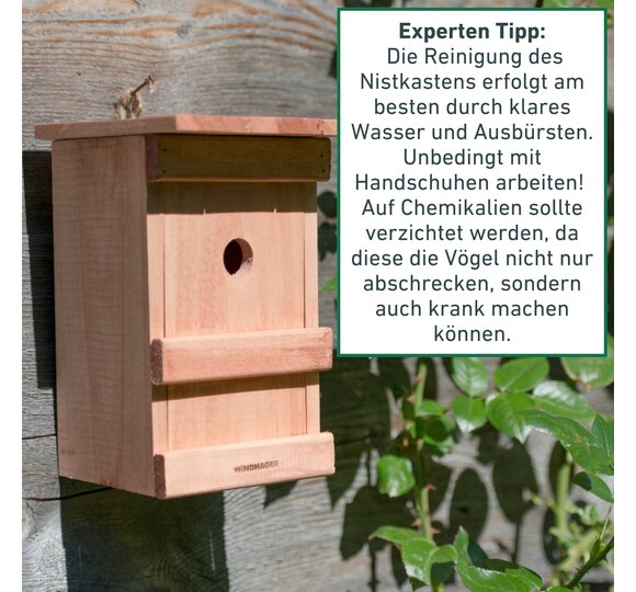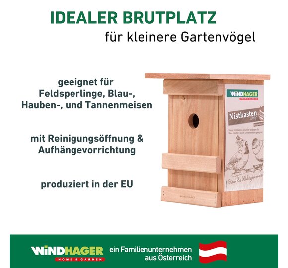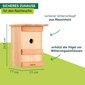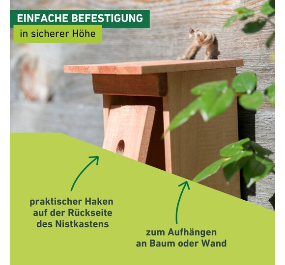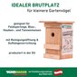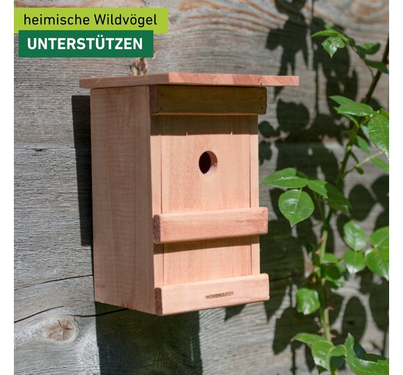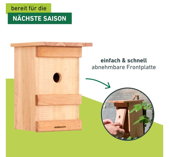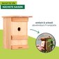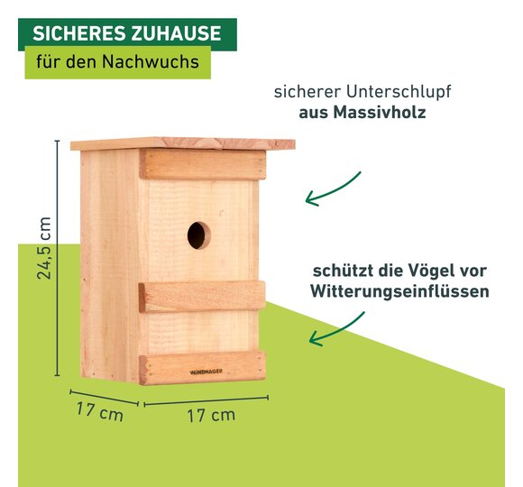 Le nichoir « Birdy » présente un trou d’entrée de 28 mm de diamètre, parfaitement adéquat pour les couvées de mésanges bleues, huppées et noires. Protège des vents violents et des prédateurs. En bois massif raboté et imprégné. La façade s’enlève facilement pour le nettoyage.