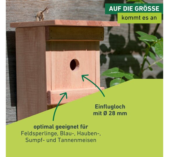 - trou d’entrée 28 mm ø, pour mésanges bleues, huppées et noires