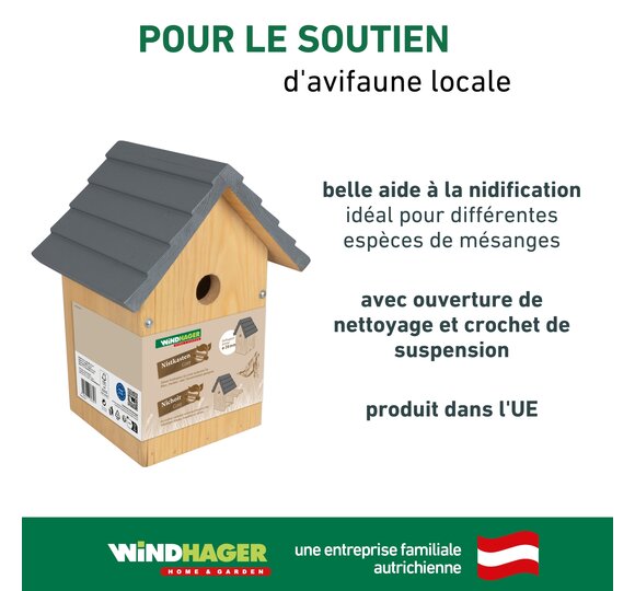 Un bon nichoir contribue à la protection de l'avifaune locale. Les mésanges se sentent bien dans le nichoir Cosy. Le corps est composé de bois de pin clair lasuré et dispose d'un toit gris pour protéger la couvée de l'humidité. Un crochet est disposé à l'arrière de la petite maison afin de pouvoir la fixer en toute sécurité. Pour effectuer un nettoyage de printemps, ouvrez simplement un côté et retirez les restes de nourriture. Le nichoir est déjà prêt à accueillir la prochaine famille.