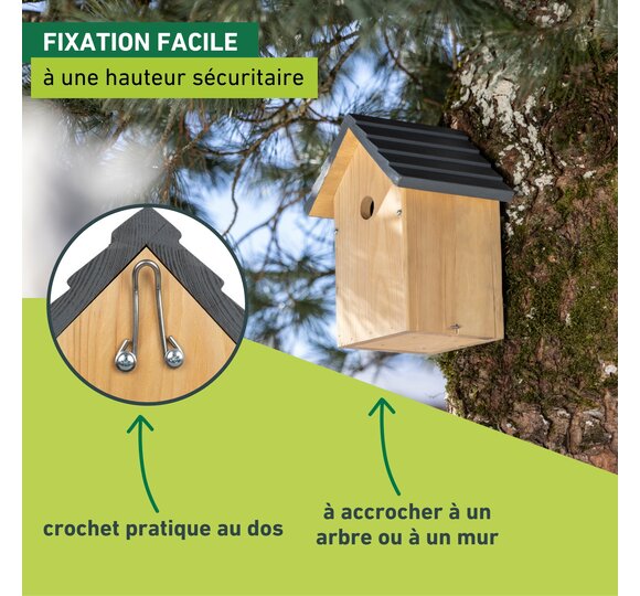 - DISPOSITIF DE SUSPENSION INCLUS - Un crochet se trouve à l'arrière du nichoir pour pouvoir l'accrocher à une hauteur sûre.