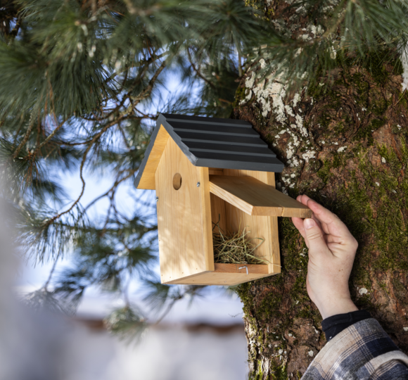 Remarque : Si le nichoir est monté sur un arbre, il est possible d'installer une ceinture anti-fouine/anti-chat pour offrir une protection supplémentaire aux oiseaux. Celle-ci ne blesse pas les animaux, elle les empêche juste de grimper.