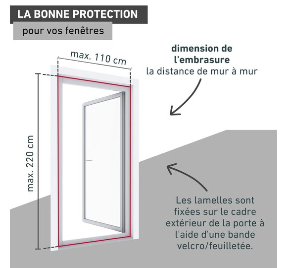 - Fixation par le biais d’une bande velcro auto-agrippante sur le cadre extérieur de la porte