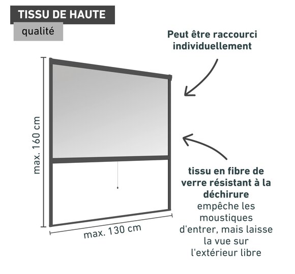 Moustiquaire enroulable pour fenêtre à fixation sans perçage Protection confortable et écologique contre les nuisibles volants La moustiquaire enroulable Windhager à accrocher combine les avantages d'un store et ceux d'une fenêtre à cadre. Le cadre en profilés d'aluminium revêtus par poudre est accroché au cadre de la fenêtre à l'aide de ressorts d'accrochage réglables. Entièrement sans perçage. Le caisson étroit contient la toile en fibre de verre robuste, qui peut être manipulée confortablement à l'aide de la poignée réglable en hauteur. Un frein de store intégré empêche la toile de se refermer de manière incontrôlée. Deux brosses d'étanchéité assurent une protection intégrale contre les insectes et les vents forts. La taille du cadre peut être raccourcie individuellement.