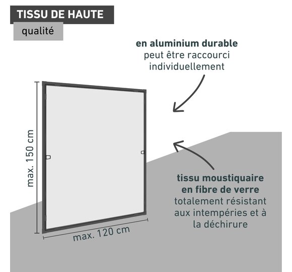 Le cadre en aluminium léger comme une plume s’accroche sans problème et se décroche si nécessaire (par ex. pour des travaux de nettoyage). Idéal également pour les appartements locatifs parce que le châssis de fenêtre reste intact. La fixation se fait au moyen de 12 ressorts d’accrochage qui assurent un bon maintien au châssis de fenêtre. Un produit résistant aux UV et intempéries avec un tissu en fibre de verre premium résistant à la déchirure.