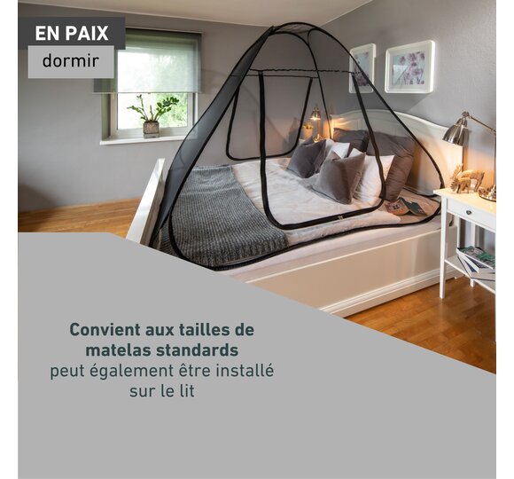 Grâce à la tente moustiquaire fiable, vous pouvez laisser vos enfants jouer tranquillement dehors sans devoir traiter plus tard les piqûres d'insectes qui les démangent. Ou vous pouvez monter la tente directement sur le lit et profiter de nuits sans être dérangé. La tente moustiquaire est disponible en trois tailles différentes et s'adapte aux matelas les plus courants. Grâce à la fonction pratique Pop-Up, vous pouvez l'emporter partout dans un sac pratique (par exemple lors de vos prochaines vacances).