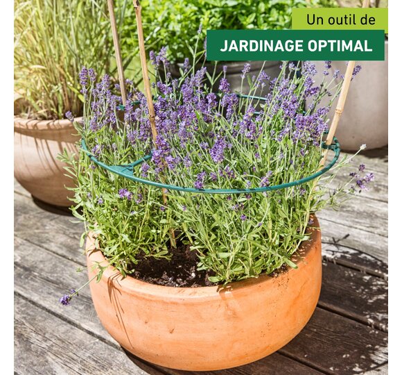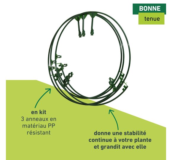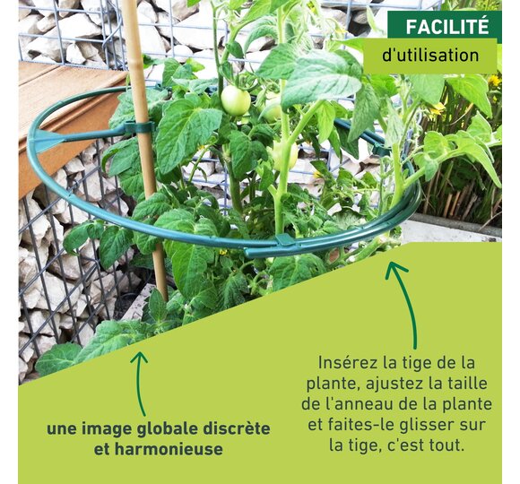 L'anneau confère de la stabilité à la plante et croît avec elle. Par son système de fixation, l’anneau « Vario » peut être rajouté ultérieurement et ajusté au diamètre en fonction de la plante.