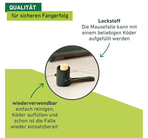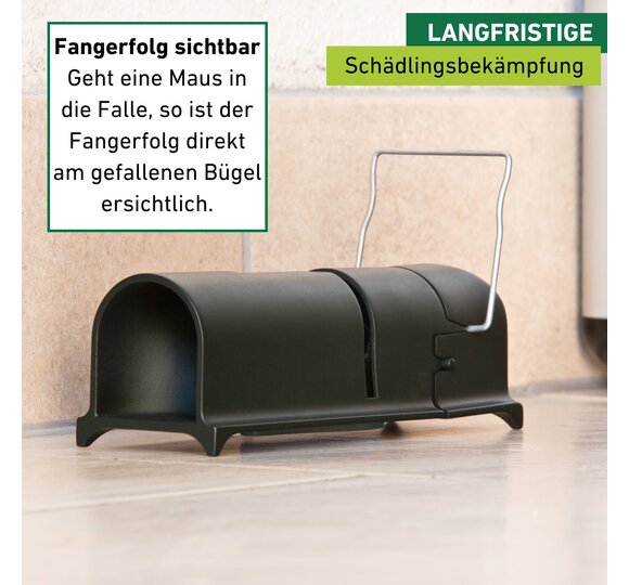 Le piège à souris doit juste être équipé d’un appât et est donc immédiatement prêt à être utilisé. Pour obtenir le meilleur résultat possible, le piège doit toujours être installé parallèlement au mur. Il ne reste plus qu’à relever l’arceau. Si le piège se referme, l’arceau tombe. De cette façon, il est possible de vérifier si un animal a été capturé sans devoir constamment jeter un œil à l’intérieur du piège. Le piège SECRET CATCH se vide ensuite en relevant simplement l’arceau sans entrer en contact avec la souris. Ensuite, le boîtier en plastique peut être facilement nettoyé, l’appât rechargé et le piège remis en place.