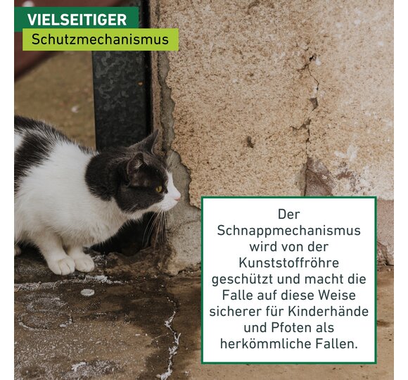 Les souris ne sont pas les bienvenues dans les salons et les garde-mangers. Avec le piège à souris SECRET CATCH, les nuisibles peuvent être capturés facilement et discrètement. Ce piège, conçu en Autriche, offre une alternative sans contact aux pièges à souris classiques. Le mécanisme de déclenchement est protégé par le tube en plastique, ce qui rend le SECRET CATCH plus sûr pour les mains des enfants et les pattes des animaux que les pièges traditionnels. Si une souris est prise au piège, la prise est visible directement par le biais de l’arceau abaissé, mais la souris reste cachée dans le piège. Le piège se vide facilement, sans contact avec l’animal.