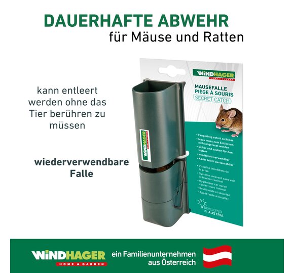 Les souris et les rats dans la maison, le grenier ou la remise sont une véritable plaie. En plus d’être désagréables, ils sont également très peu hygiéniques. Il existe plusieurs moyens de s’en débarrasser. Des appareils à ultrasons qui fonctionnent également contre les martres, des pièges à souris classiques ou des pièges à animaux vivants respectueux de l’animal capturé. Avec les produits Windhager contre les souris et les rats, vous pouvez à nouveau vous déplacer d'une pièce à l’autre en toute tranquillité.