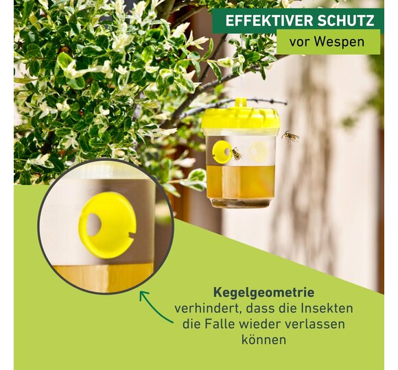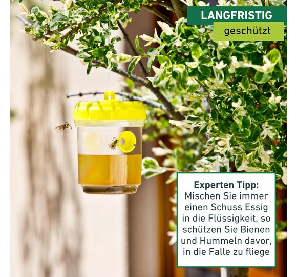 Remplir tout simplement le piège à guêpes avec un liquide sucré, comme de la limonade ou du jus de pomme. Les mouches et les guêpes sont ainsi attirées. Une fois prises au piège, elles ne trouveront aucune échappatoire. Le piège en forme de cône empêche les insectes de s’en échapper. Mélangez un filet de vinaigre dans le liquide, cela empêchera les abeilles et les bourdons de voler dans le piège. L’appât doit être remplacé au bout de 6 semaines. Le plastique se nettoie sans problème. Il suffit ensuite de remplir le piège à nouveau.