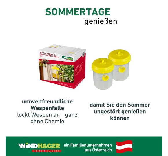 Lorsque vous savourez une boisson rafraîchissante ou une glace à l’extérieur lors d’une journée ensoleillée, les guêpes ne sont généralement pas loin. Les mouches sont généralement toujours de la partie lorsqu’un repas est organisé dans le jardin, sur la terrasse ou sur le balcon. Ces insectes ne sont pas seulement gênants, une piqûre de guêpe peut aussi rapidement devenir dangereuse. C’est là qu’entre en jeu le piège à mouches et à guêpes Windhager. Il sauvera vos journées d’été à l’extérieur. Double effet pratique : même les moustiques tombent dans le piège.