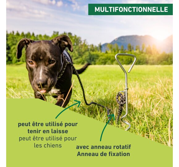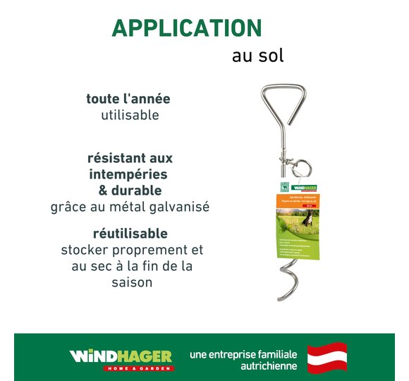 Lorsqu’il s’agit de garantir une fixation en toute sécurité, le piquet d’ancrage spirale est la solution de choix. Les bâches de protection et multifonctions peuvent être tendues en toute sécurité avec ce piquet, tout comme les voiles d’ombrage et les trampolines. Pas seulement dans votre propre jardin, mais aussi en déplacement, le piquet d’ancrage spirale peut être utilisé de manière optimale : par exemple en camping, pour tendre les tentes de manière fiable. Il peut même servir d’ancre mobile pour attacher des chiens, car la bague de fixation rotative empêche la laisse de s’emmêler.