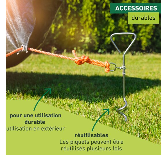- pour maintenir solidement les bâches, voiles d’ombrage, tentes, trampolines