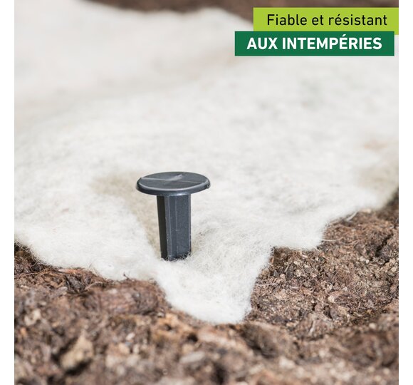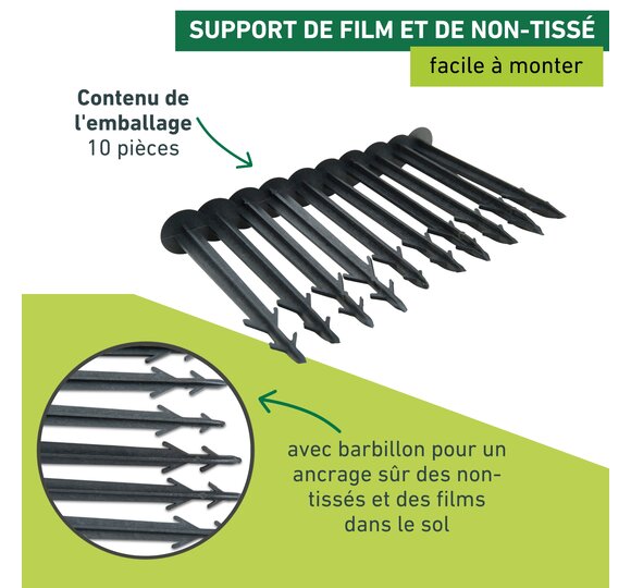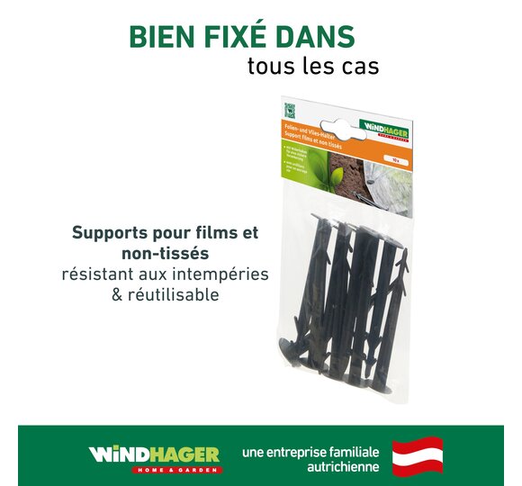 Les solutions de fixation simples des films et des voiles restent solidement ancrées dans le sol et constituent un moyen de fixation sûr. Tandis que les tuteurs évitent que les filets et les plantes n’entrent en contact direct, les protégeant ainsi contre les dommages, les piquets maintiennent fermement en place les tapis de mauvaises herbes, bâches en tissu, films pour parterres et filets dans le sol.