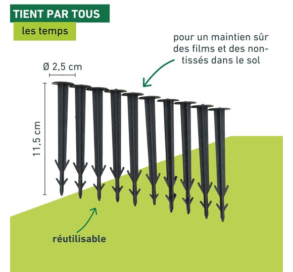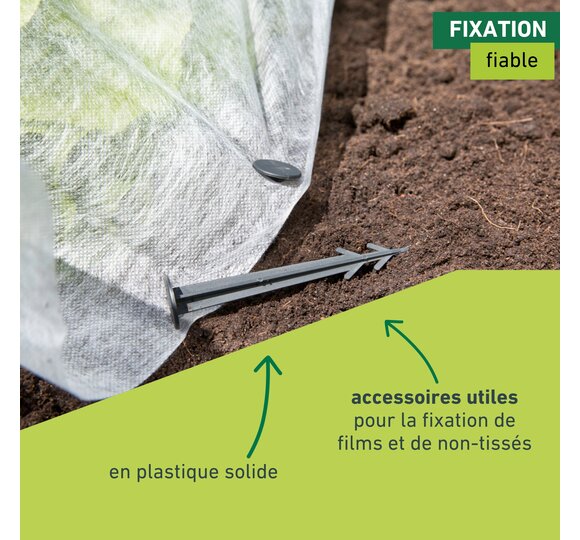 Piquets de fixation en plastique avec crochet permettant d’ancrer en toutes circonstances les voiles et films dans le sol.