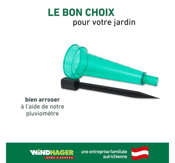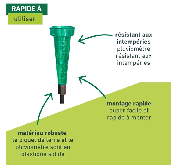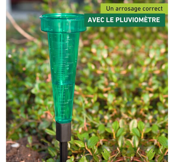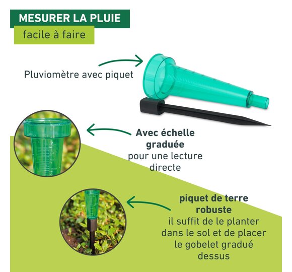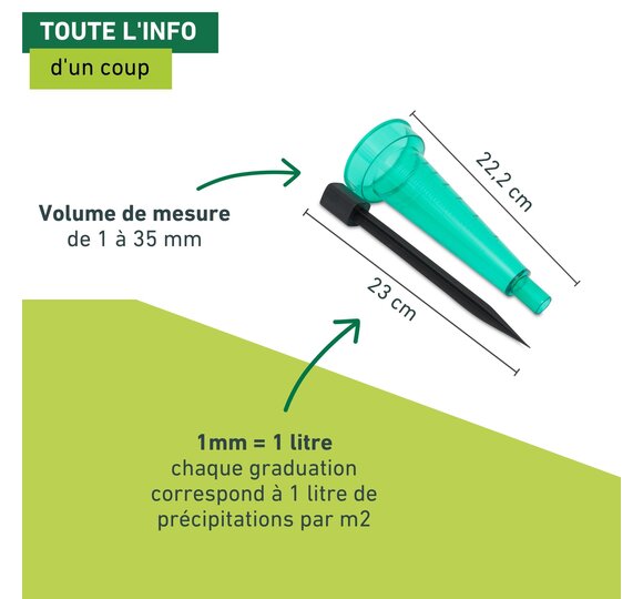 Chaque graduation correspond à 1 litre de précipitation/m² Avec un pluviomètre, il est possible de savoir précisément quand il faut à nouveau arroser. Piquet de terre en plastique inclus.