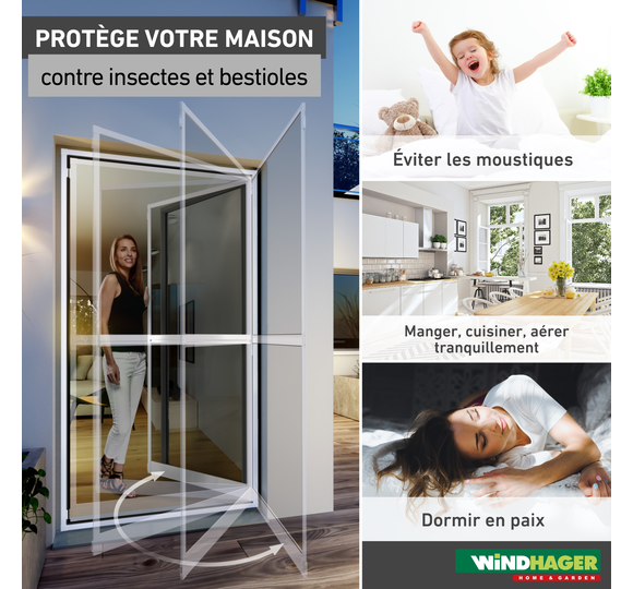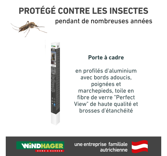 Avec une porte moustiquaire, vous faites un grand pas vers une maison à l'abri des moustiques. La porte battante EXPERT de Windhager est idéale pour les passages fréquents sur le balcon ou la terrasse. Elle s'ouvre facilement à l'aide de la poignée continue ou, si l'on n'a pas la main libre, on peut la pousser avec le pied. Grâce à des charnières spéciales et à des aimants, elle revient dans sa position initiale et se ferme d'elle-même de manière fiable. La moustiquaire est très étroite et trouve également sa place entre le volet roulant et le cadre de la porte.