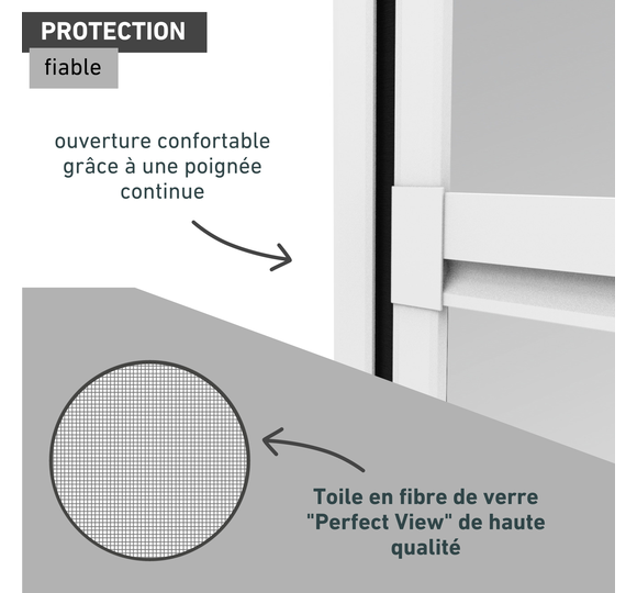 La stabilité de la porte battante moustiquaire est assurée par un cadre en profilés d'aluminium robustes et revêtus par poudre et par un croisillon central. Les bords biseautés confèrent à l'ensemble un aspect et un toucher plus doux. Une tôle de marche robuste protège le tissu et permet de pousser la porte des deux côtés avec le pied. La porte s'ouvre à la main grâce à la poignée continue. Grâce à la toile en fibre de verre "Perfect View" anthracite presque invisible, on conserve une vue dégagée sur l'extérieur. L'air frais et la lumière passent, les moustiques ne peuvent pas entrer. Des brosses d'étanchéité sur tout le pourtour ferment même le dernier espace vers le mur et protègent même des plus petits insectes. La moustiquaire est fixée au cadre de la porte. Des charnières solides, renforcées de fibres de verre, permettent à la porte battante de pivoter dans les deux sens et de se fermer d'elle-même ; des aimants la maintiennent fermée en toute sécurité.
