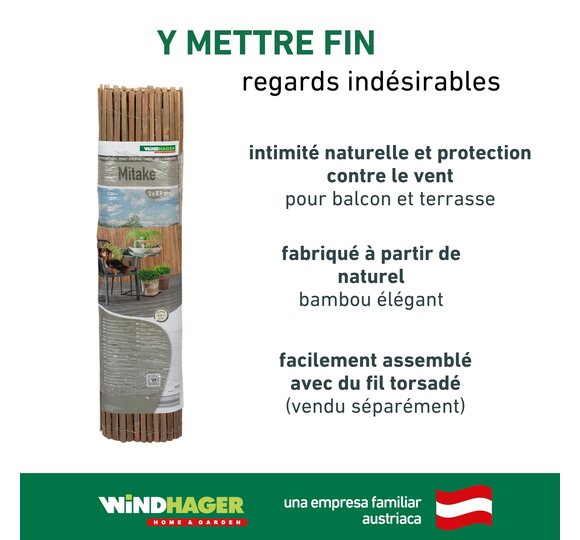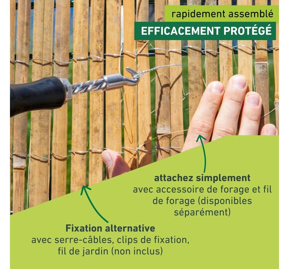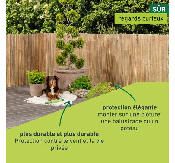 Le bambou est particulièrement résistant et le brise-vue peut être aisément fixé à la clôture, au parapet ou avec des poteaux.