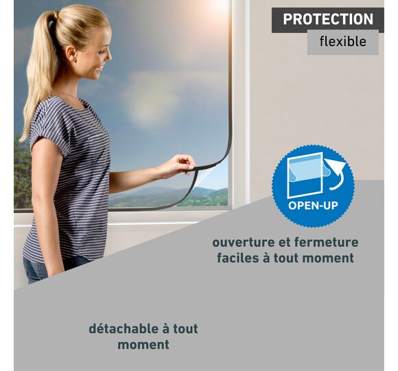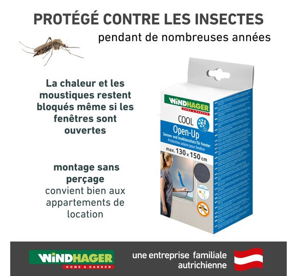 Moustiquaire avec protection solaire facile à ouvrir et à fermer La moustiquaire pare-soleil Open-UP s'ouvre et se referme facilement pour arroser les fleurs ou aérer le linge de lit. Laissez-vous convaincre par la simplicité du montage intérieur de la moustiquaire à l'aide de la bande velours et velcro autocollante. Adaptable à la taille de votre fenêtre, cette alternative économique protège les pièces intérieures des insectes qui piquent et vrombissent. En même temps, la chaleur reste à l'extérieur, même lorsque la fenêtre est ouverte. Le tissu à revêtement spécial réduit le réchauffement de l'intérieur en réfléchissant les rayons du soleil. Comme il n'est pas nécessaire de percer le cadre de la fenêtre, la moustiquaire Open-UP est prédestinée aux appartements en location.