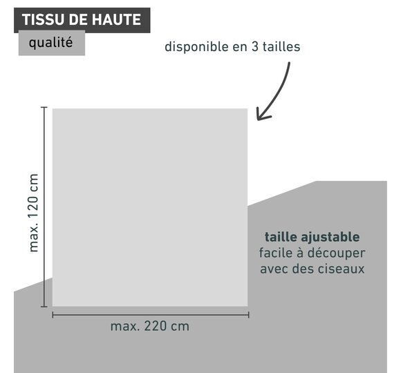 - COUPE - La toile de protection solaire est simplement coupée à la taille souhaitée à l'aide de ciseaux. Disponible en 3 tailles, crochet adhésif inclus.