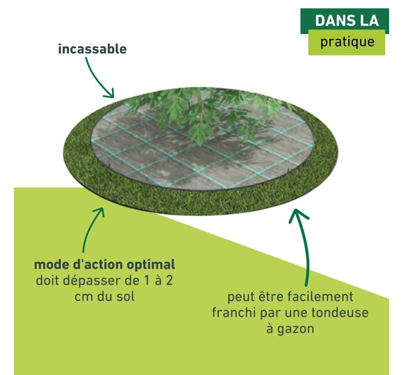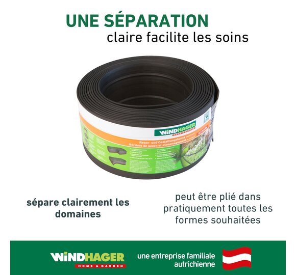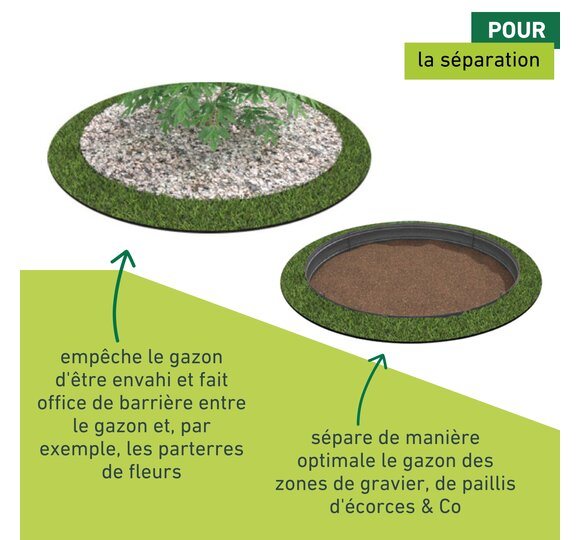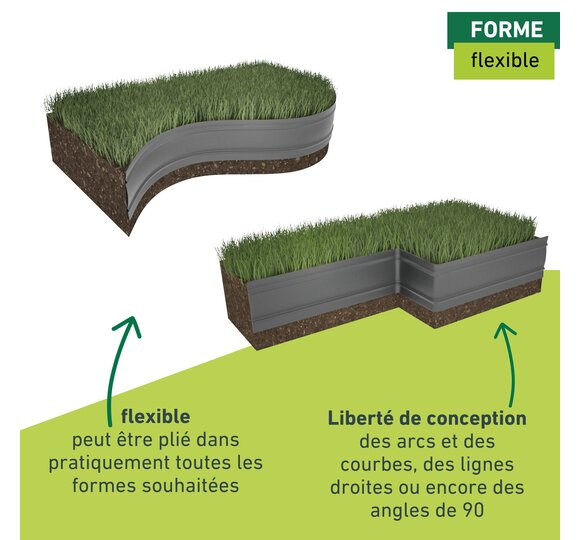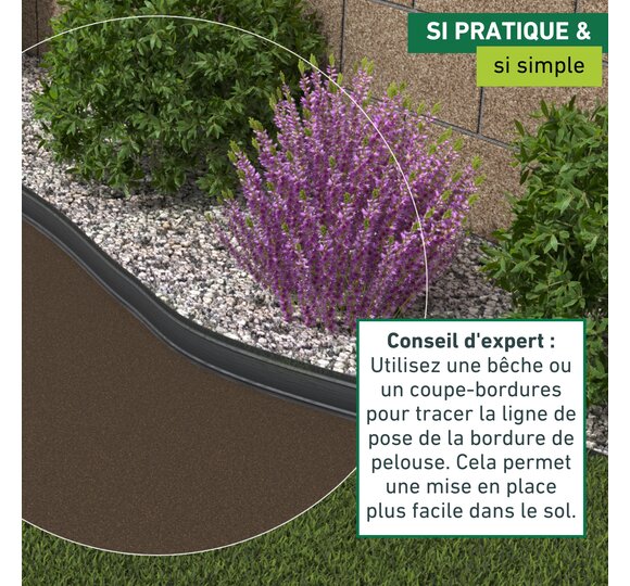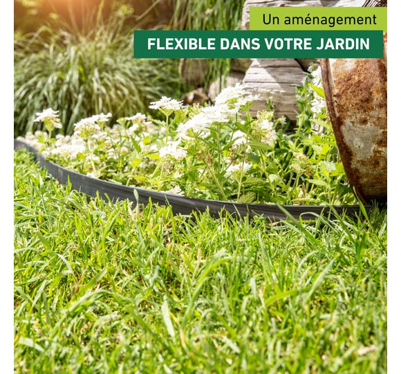 Flexible et robuste en même temps. N’éclate et ne rompt pas. La bordure de gazon est simplement incurvée dans la forme souhaitée. Cela vous donne de la liberté pour la conception de d’arcs et de courbes, de droites ou d’angles droit. Aucune limite n’est posée à votre vision. La bordure de gazon empêche la croissance illimitée du gazon et se présente comme une barrière entre le gazon et p. ex. les platebandes de fleurs. Elle peut être écrasée sans problème par la tondeuse. Pour un mode d’action idéal, la bordure doit dépasser d’environ 1-2 cm de la terre.